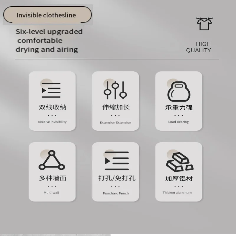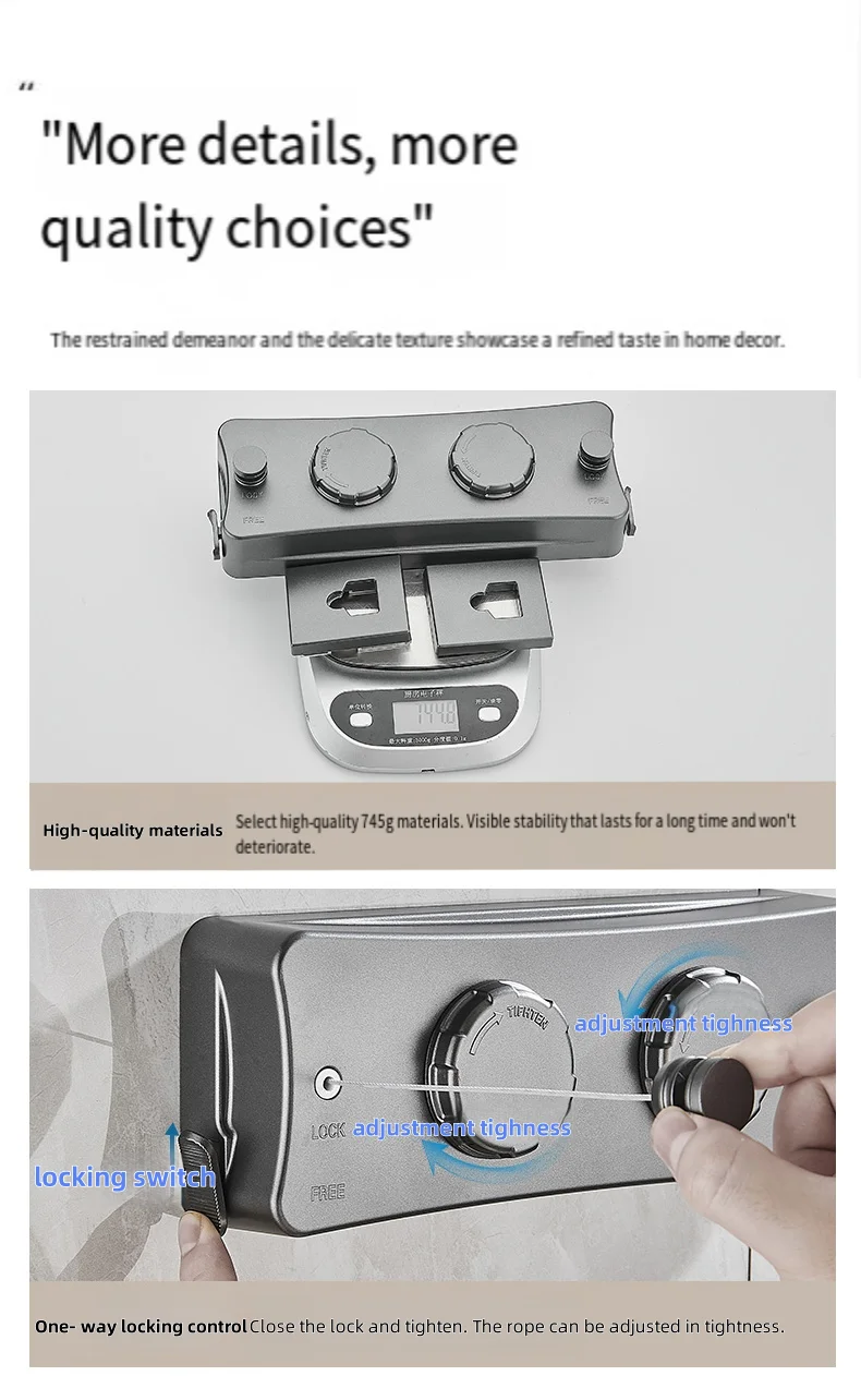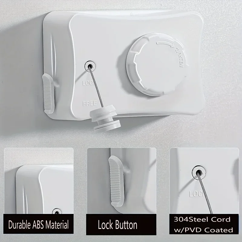 【Durable Material】: Adopted durable ABS case, aluminum bracket and 304 stainless steel, the retractable clothesline is waterproof, rustproof and has excellent load-bearing capacity, which meet the needs of most people.