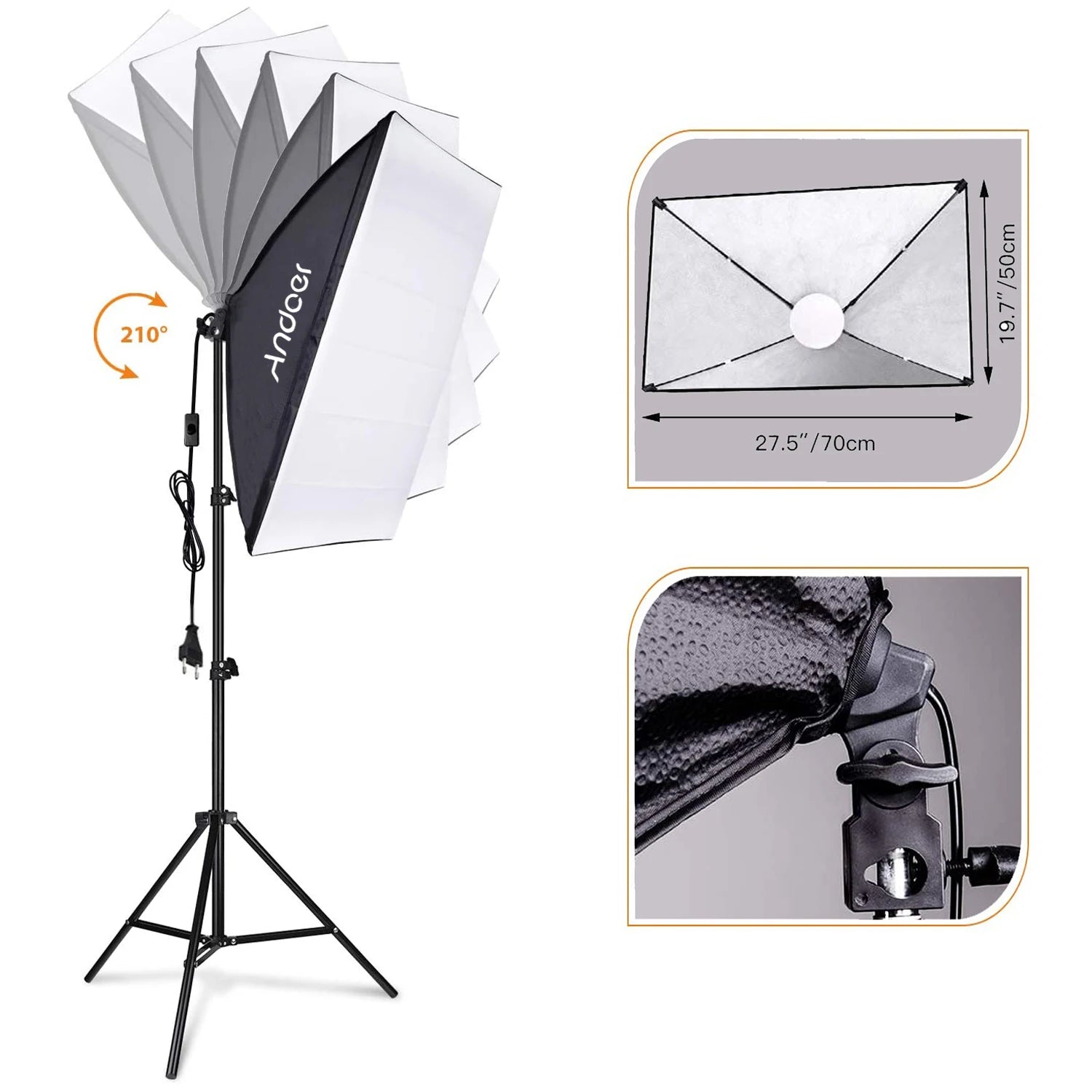 Large Flexible Softbox:50 * 70cm/ 20 * 28in large softbox with white diffuser cloth provides you with perfect even lighting; with E27 socket for direct installation of LED light; and the softbox can 210° rotate to let you have optimal light angles, making your photos and videos more professional.