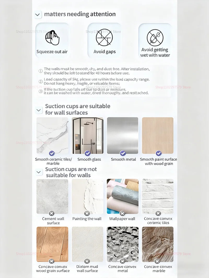 • Enhanced Adhesive & Installation Guidance: Features a strong, reusable suction cup designed for flat, smooth surfaces — including glass, tiles, and polished metal. For optimal adhesion, thoroughly clean the surface and the suction cup prior to installation. Ensure the wall is entirely flat, crack-free, and free of holes or unevenness. Follow the detailed installation instructions and images provided for precise mounting.