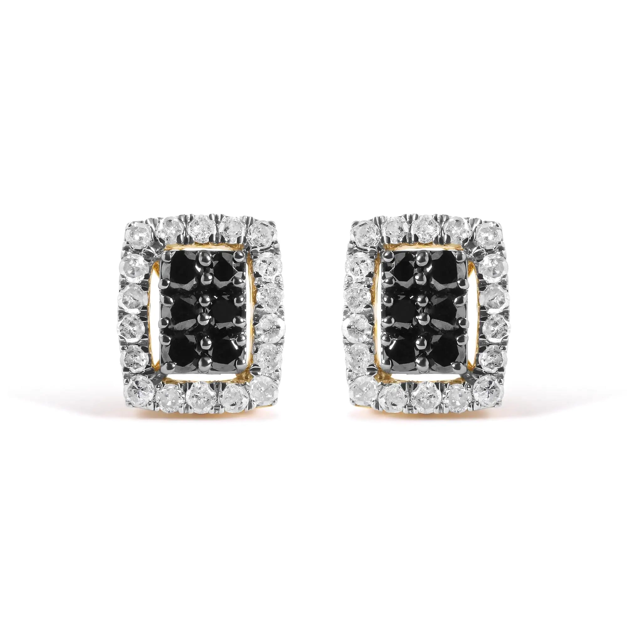 Indulge in the luxury of these stunning diamond stud earrings. Crafted from gleaming 10K yellow gold, these earrings boast a mesmerizing combination of black and white diamonds. With a total of 48 natural diamonds, including 12 black color treated diamonds and 36 white diamonds, these earrings sparkle with a total weight of 1.0 carats. The round shape of each diamond adds to the timeless elegance of these earrings, making them a perfect addition to any man's jewelry collection. The I-J color and I2-I3 clarity of the diamonds add to the unique and captivating design. These earrings are held securely in place by screw on finding, ensuring they stay put all day. Add a touch of sophistication to any outfit with these men's black and white diamond stud earrings.