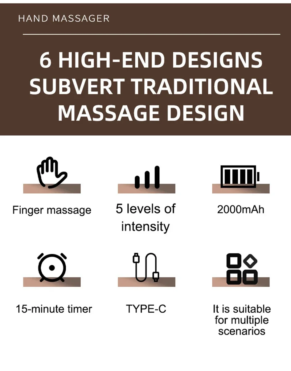 We hopes to help you relieve hand fatigue,whether you are doing physical labor, playing an instrument, coding, or after exercise. It has upgraded the massage intensity. The first level of massage intensity is relatively gentle for protecting people who are not under pressure; the third level of massage intensity is moderate force, even force; the five level of massage intensity is more suitable for deep tissue deep relaxation.
